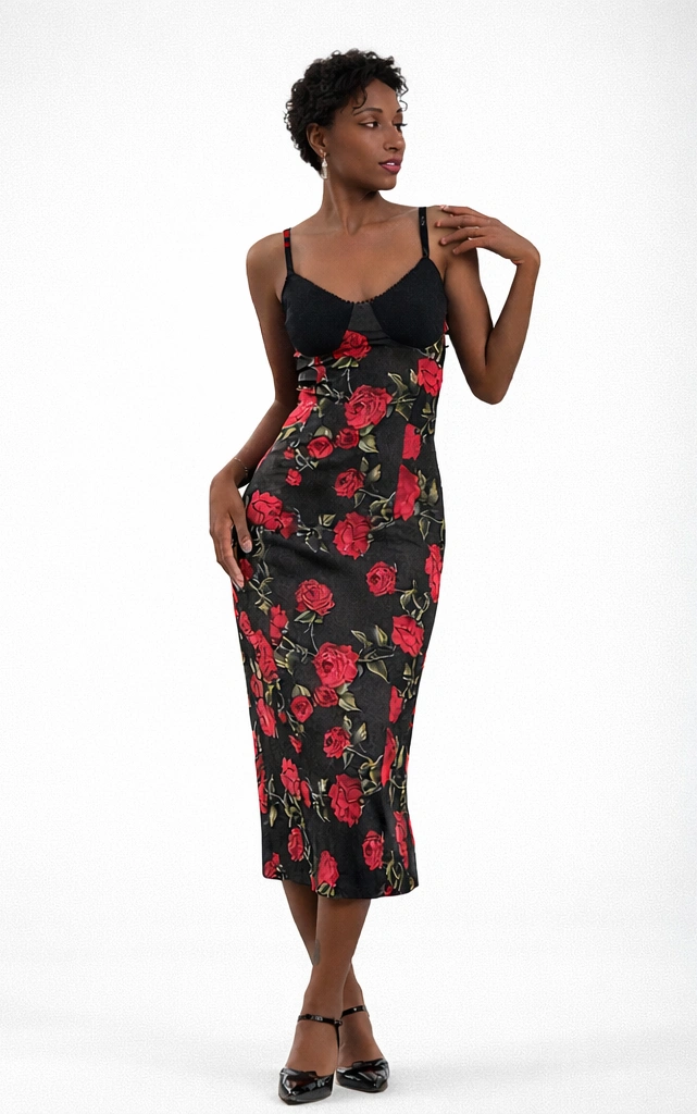 With its elegant strappy design and figure-hugging silhouette, the Rose Élégance Silk Dress offers a feminine and sophisticated look. Its midi length, combined with the romantic effect of the rose patterns, creates timeless elegance. It’s a perfect choice for special occasions and evening dinners.